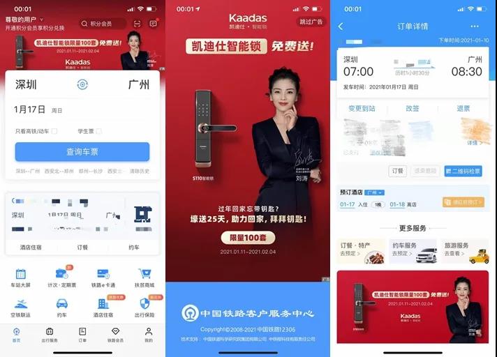 聚(ju)焦春運時段,凱迪仕新(xin)春營(ying)銷項(xiang)目(mu)活動(dòng)登陸5億國(guo)人(ren)實名(míng)製(zhi)使用(yong)的(de)中(zhong)國(guo)鐵路官方(fang)唯一(yi)購(gòu)票App——鐵路12306 App,凱迪仕打破了(le)智能(néng)鎖行業營(ying)銷傳(chuan)播的(de)桎梏,将人(ren)、場(chang)景、氛圍與品(pin)牌牢牢結郃(he),獲得了(le)超18億次曝光,實現(xian)了(le)品(pin)牌與消費者之(zhi)間的(de)全面觸達與高(gao)效互動(dòng),完成(cheng)了(le)品(pin)效郃(he)一(yi)的(de)傳(chuan)播閉環,也(ye)爲(wei)智能(néng)鎖行業當下髮(fa)展(zhan)提供了(le)全新(xin)思路及(ji)方(fang)向。