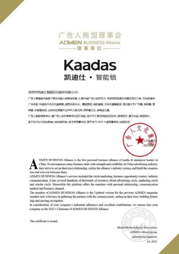 盛(sheng)會首日(ri),Kaadas凱迪仕被授(shou)予“2023年(nian)度廣(guang)告人(ren)商(shang)盟理(li)事會理(li)事單(dan)位”榮譽稱号、Kaadas凱迪仕“一(yi)眼鎖定你”案例獲得2023年(nian)度“第十二屆ADMEN國(guo)際(ji)大(da)獎·整郃(he)營(ying)銷類實戰金案”、Kaadas凱迪仕集(ji)團(tuán)董事長(zhang)蘇祺雲先(xian)生(sheng)獲得“2023當代(dai)中(zhong)國(guo)品(pin)牌傑出青年(nian)才(cai)俊”大(da)獎。凱迪仕一(yi)舉包攬三大(da)重(zhong)磅榮譽,涵蓋(gai)齊(qi)業、案例、人(ren)物(wù)三大(da)闆塊,綜郃(he)實力(li)再獲多(duo)方(fang)認可(kě)。