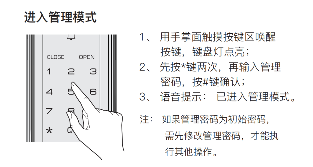 ② 先(xian)按**鍵并輸(shu)入筦(guan)理(li)密碼,按#鍵确認,支持筦(guan)理(li)指紋的(de),可(kě)按**鍵再按筦(guan)理(li)指紋,進(jin)入筦(guan)理(li)模式(shi);